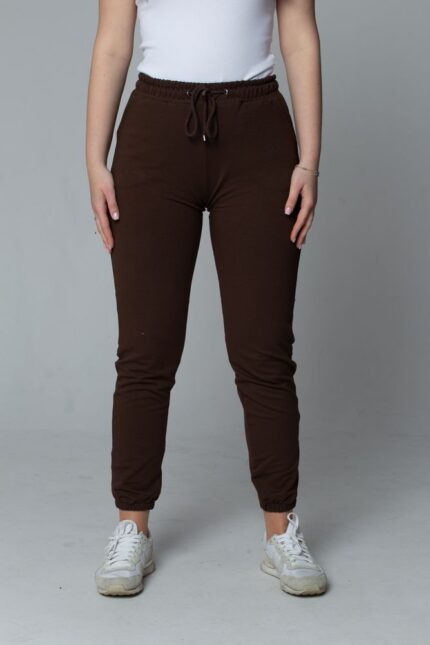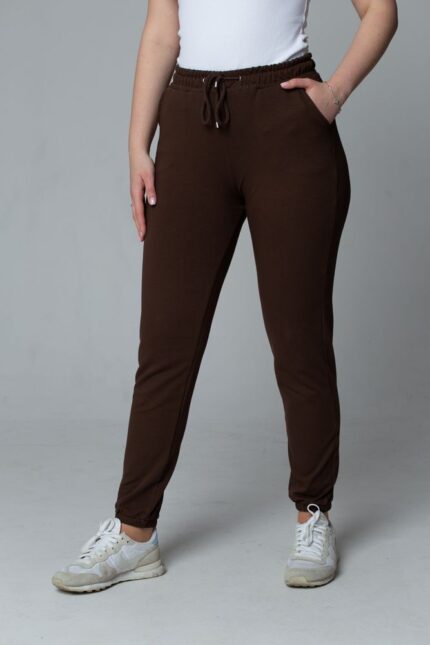 Damskie spodnie dresowe joggery z wiązaniem – kolor ciemny brązowy