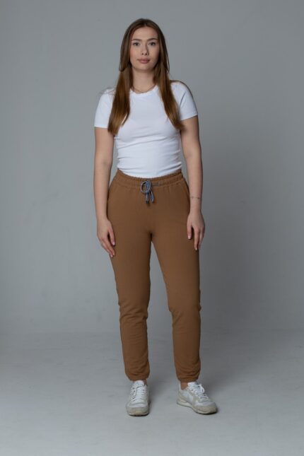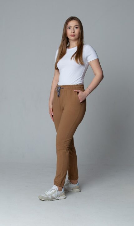Damskie spodnie dresowe joggery z wiązaniem – karmelowy brąz